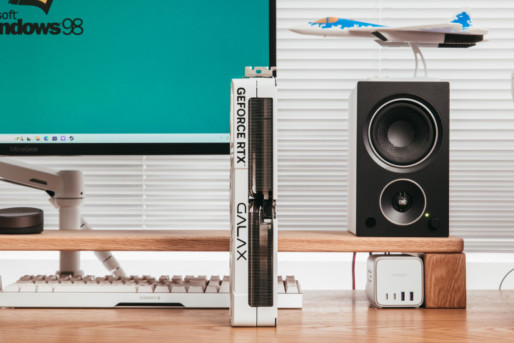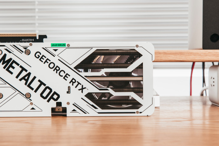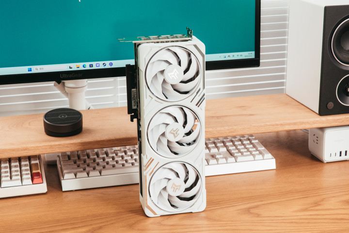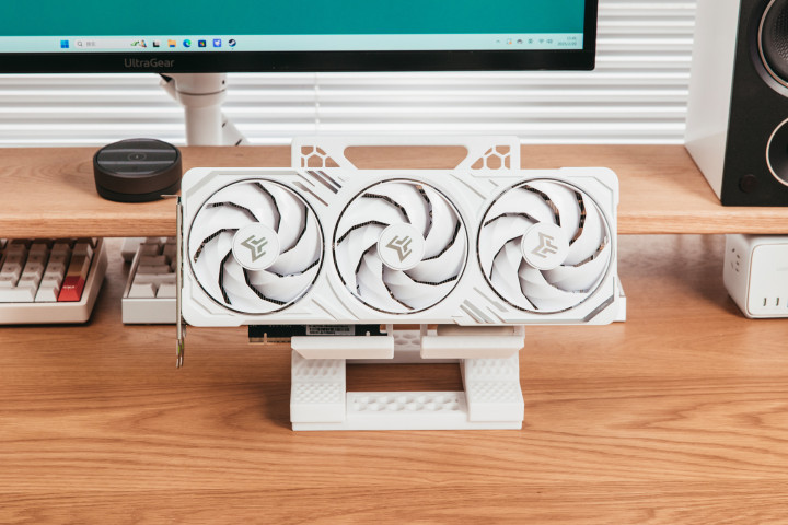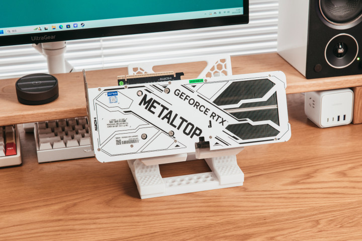 换个角度,得益于50系显卡尺寸的全面向小看齐,影驰 RTX 5080 金属大师白金版 OC这张显卡在机箱中的体积占比终于回归正常了。