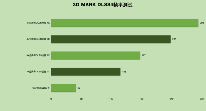 4K分辨率DLSS4测试,不开启帧率仅有49帧,质量模式下2X、4X成绩分别是138、238帧,提升幅度分别是182%、385%,性能模式下更最497%。