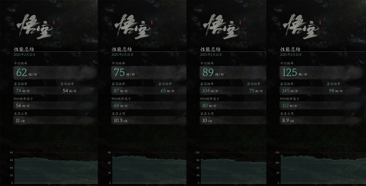 画质影视级且光追设置为最高,DLSS分别设置为质量(采样参数70)、均衡(采样参数55)、性能(采样参数40)、极致性能(采样参数25),帧率分别为62、75、89、125。