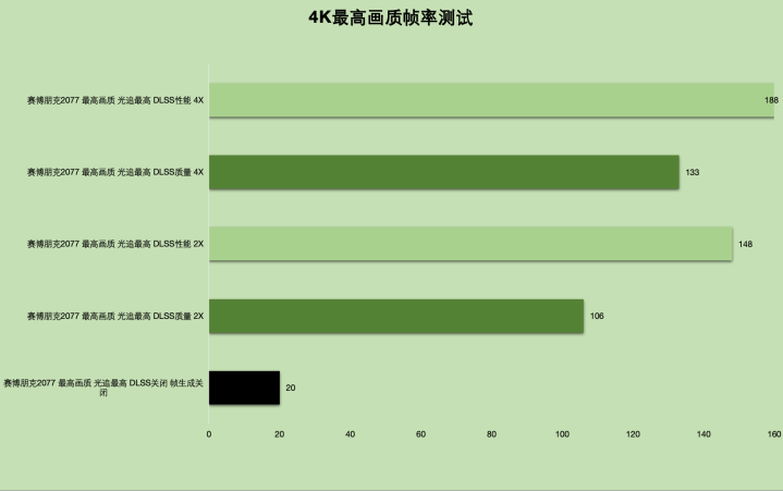 4k分辨率下最高画质,光追开到最高,DLSS和多帧生成全部关闭的场景下,分辨率仅有20帧,而开启2X、4X,在DLSS设置为质量的前提下,帧率分别提升到了106、133帧;性能模式下,2X、4X设置下帧率提升到了148、188帧。
