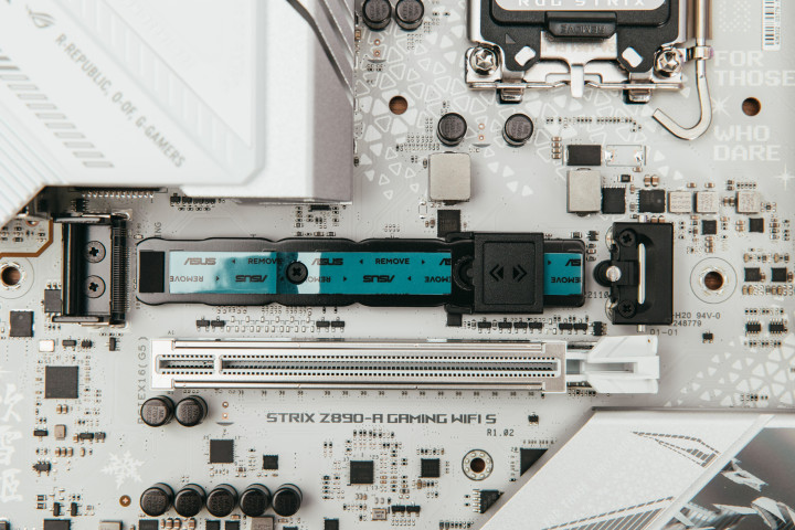 拆掉全部三个散热装甲后,下方一共是5个M.2插槽,除了主插槽外,其余四个均为PCIe 4.0规格,也均支持便捷卡扣2.0,可以免工具安装SSD。