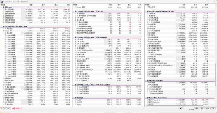 室温大约18度双拷状态下核心平均温度76度,封装温度83度,最高88度,出现了轻微降频,封装功耗179W,平均177W,P核平均5.28Ghz,最大5.3Ghz,E核平均4.6Ghz,最大4.6Ghz;显卡温度表现正常,63.5度,功耗350W。