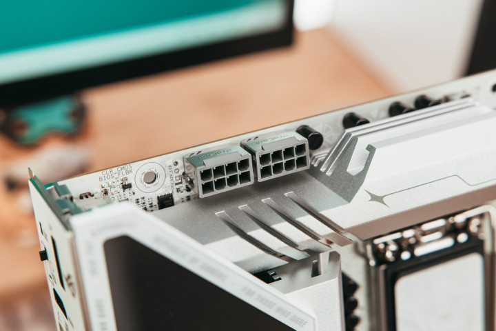 灰色加固处理的双8pin处理器供电口,外包裹金属层强化。