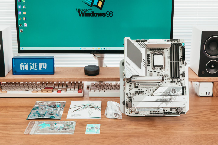 全家福展示,依旧有着二次元看官们最爱的贴纸和周边,标致性的白色底座天线,右侧本体造型方正,和X870吹雪一样采用全白PCB,整体观感更佳。